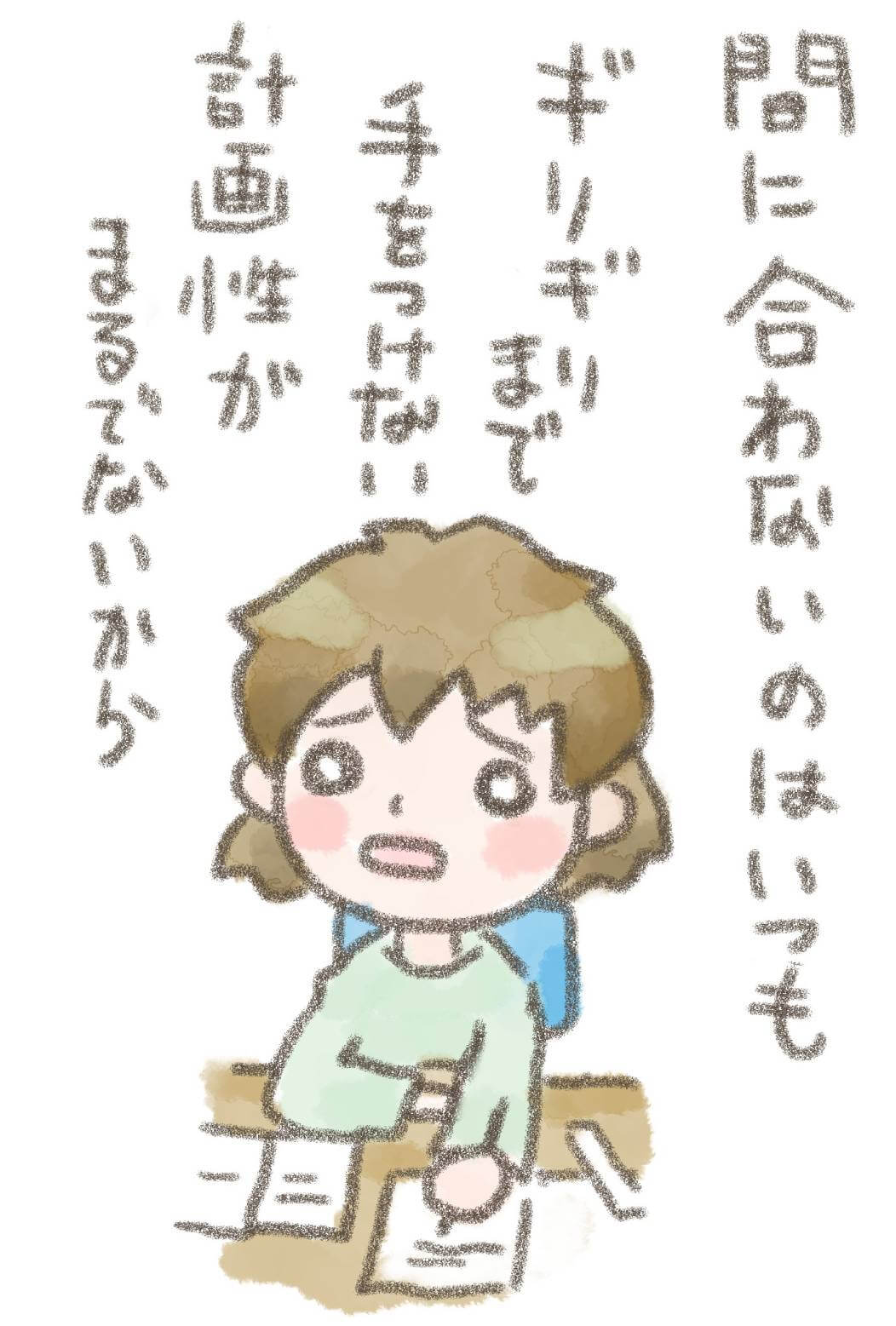 直前まで手を付けないで忘れていたり、違うことをしていたりと無計画。また、いつでもできると思い危機感がない。さらには時間の計算や感覚が鈍いために思った以上に時間がかかる事が多い等々。本当に困っている。